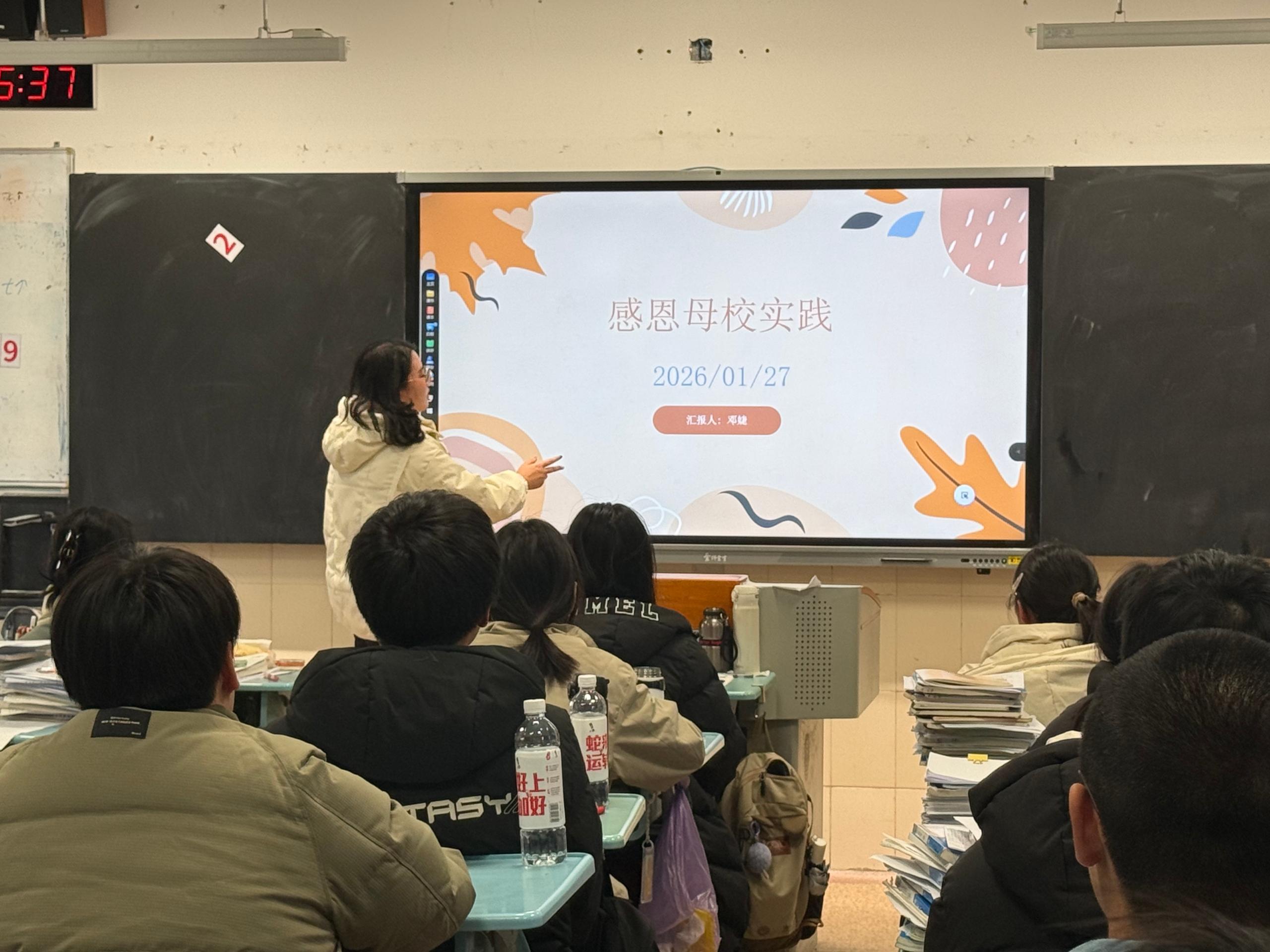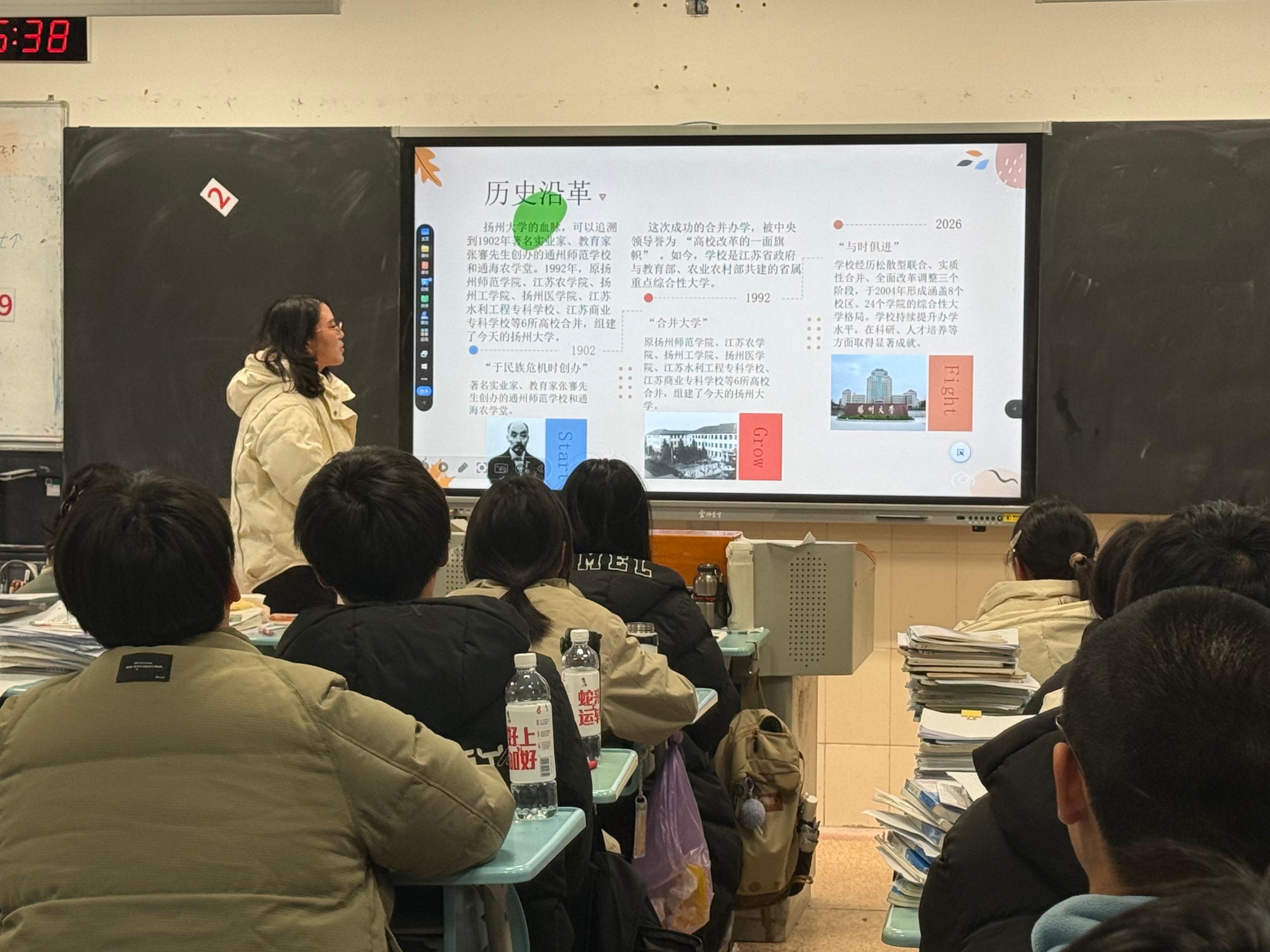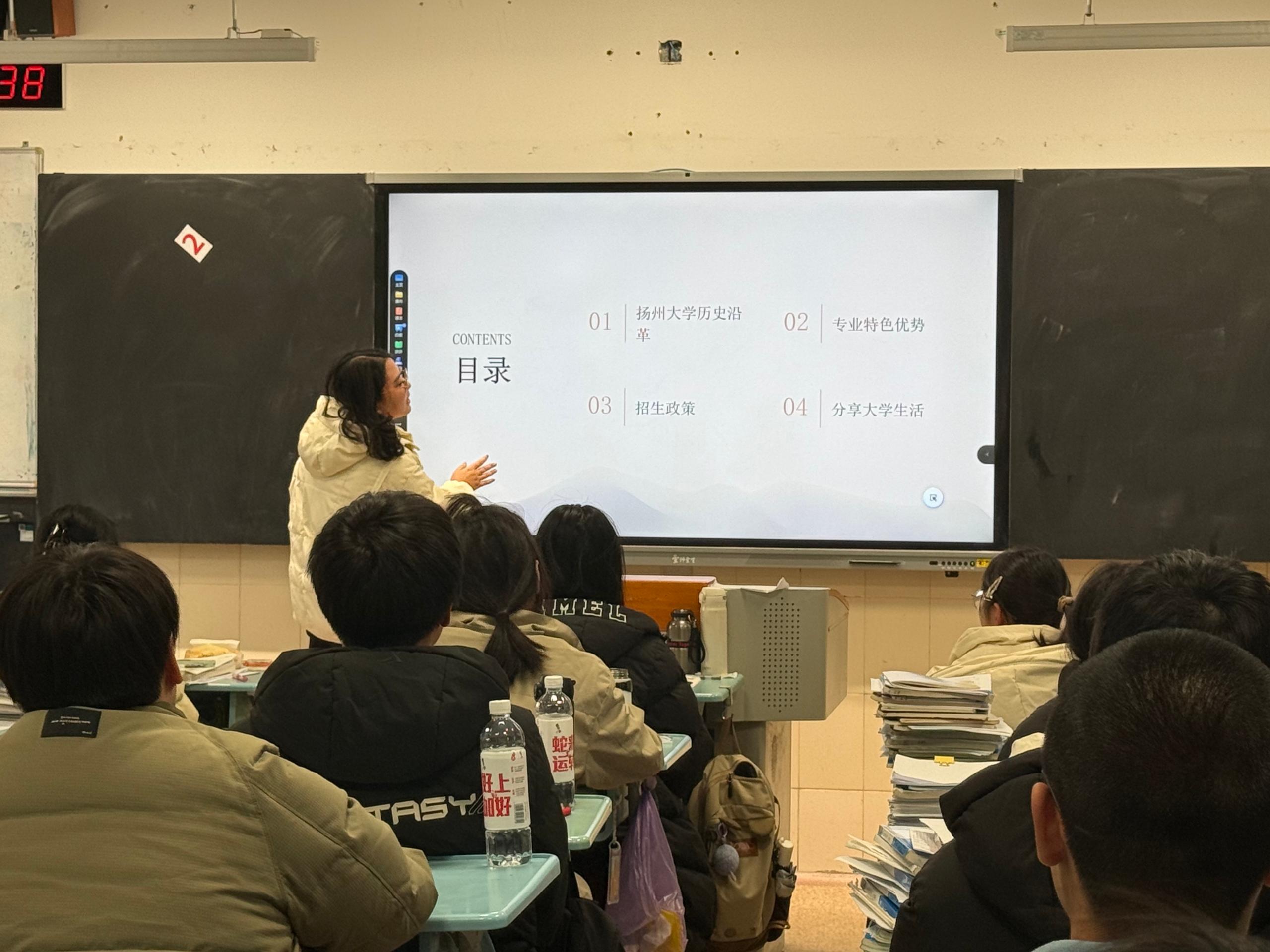 2026年1月27日,扬州大学食品学院学生邓婕返回其高中母校——江苏省外国语学校,开展了一场以“感恩母校,筑梦扬大”为主题的社会实践与高校招生宣讲活动。活动通过系统介绍扬州大学的办学特色、招生政策与校园生活等,为高中学子提供了关于高校信息直接的沟通平台。