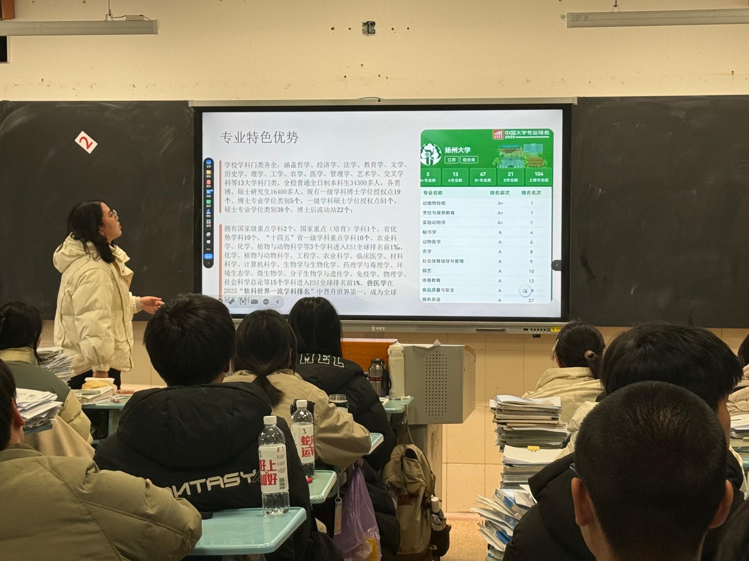 宣讲内容围绕扬州大学的办学历史、学科实力与招生政策展开。邓婕简要介绍了学校自1902年张謇创办通州师范学校以来的发展脉络,提及1992年六校合并组建扬大等重要历程。在学科优势方面,她着重说明了学校涵盖13大学科门类的综合性布局,并提及食品科学与工程、动植物检疫等专业在学科评估中的突出表现,以及农业科学、化学等学科进入ESI全球前1%的学术实力。