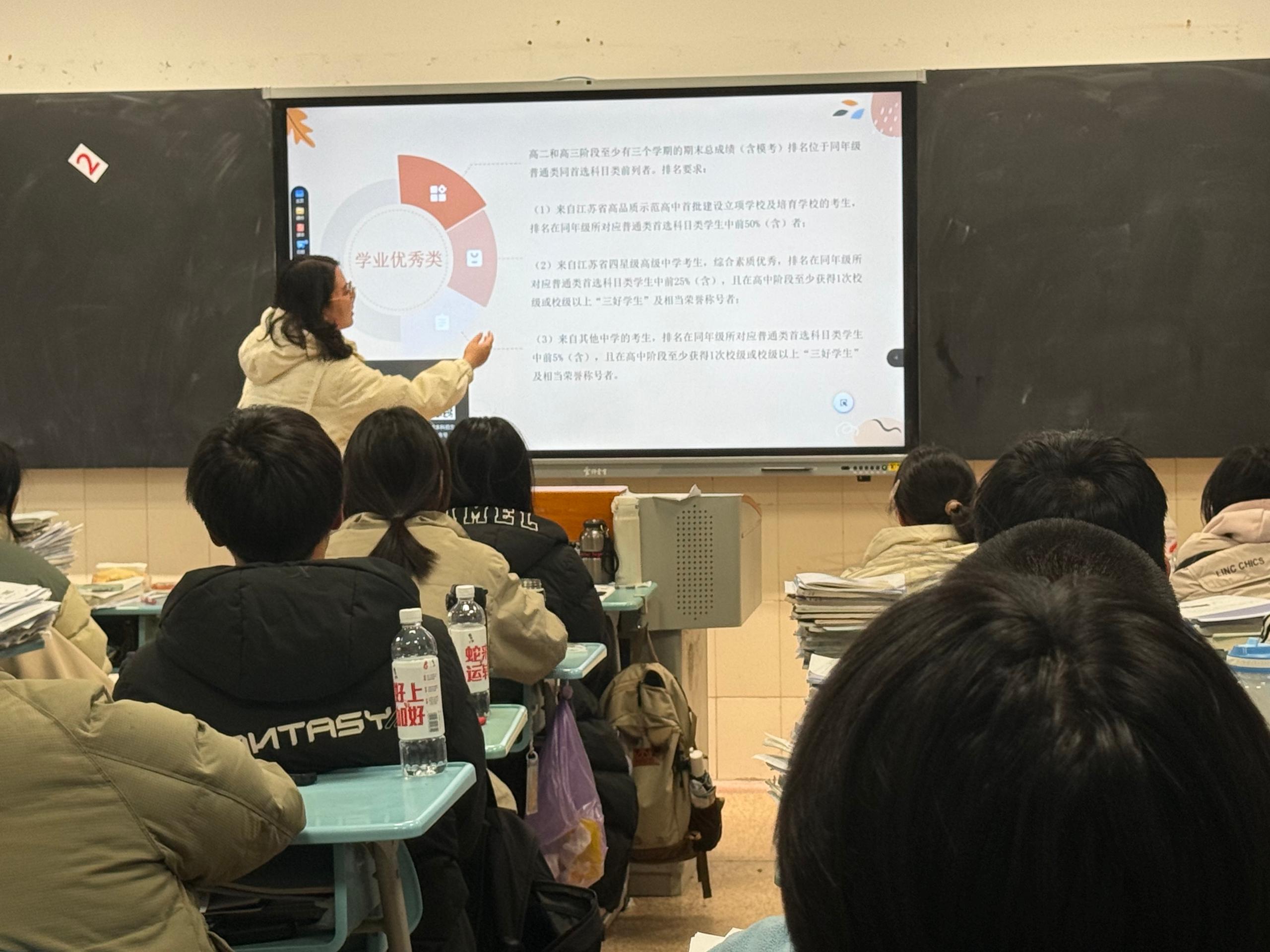 针对高三学生关注的招生问题,邓婕结合《扬州大学2025年综合评价招生简章》,讲解了招生对象、报名条件与专业计划等关键信息,并举例说明了不同类别高中的学业成绩及排名要求,为有意向的学生提供了清晰的路径参考。