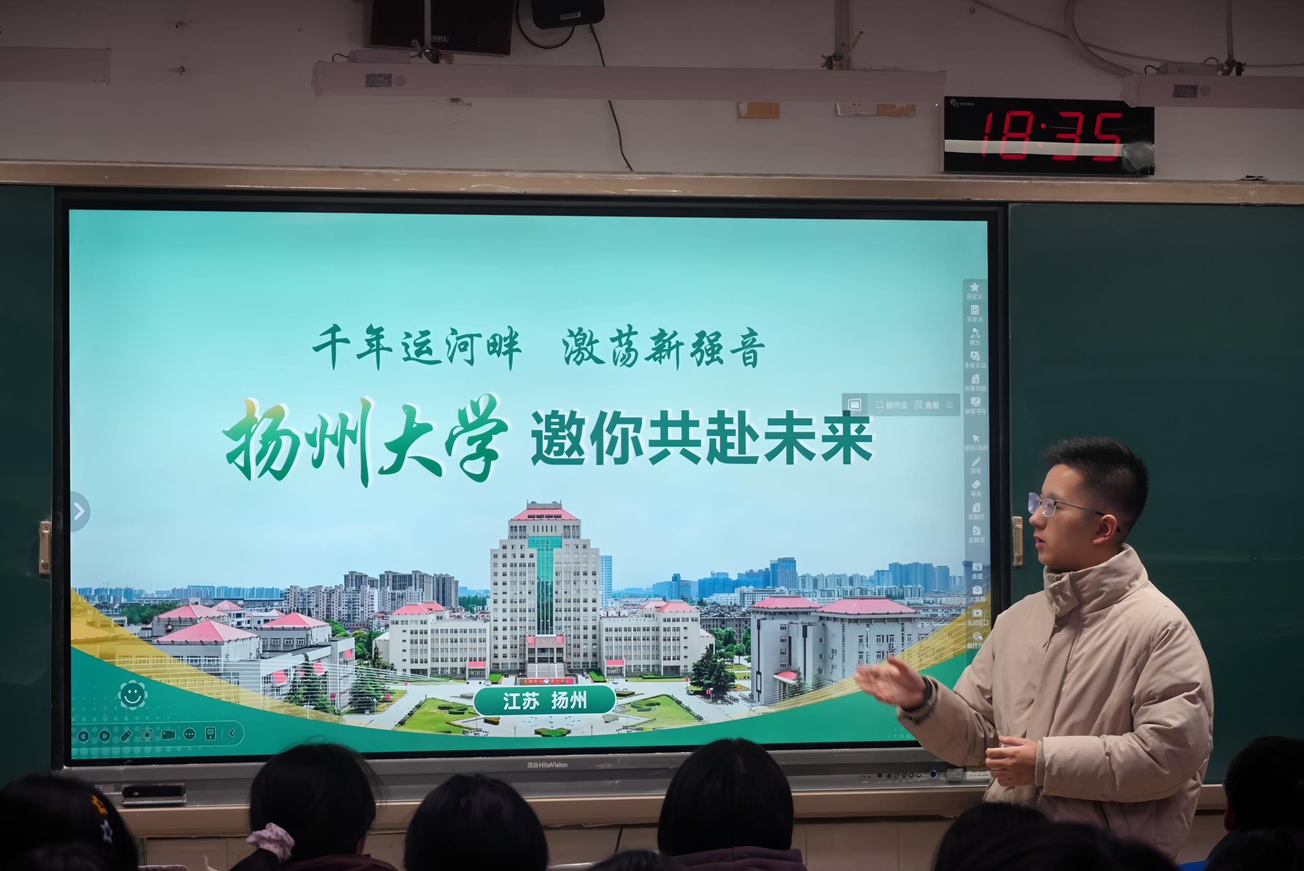 宣讲伊始,韦人溥以“立春”时节的生机寓意开篇,结合自身高中奋斗经历,分享了备考阶段的高效学习方法与心态调节技巧。随后,他和团队成员主要围绕扬州大学的办学特色、学科优势展开介绍,详细解读了食品质量与安全专业的课程设置、实践平台与就业前景,通过实验室检测实操、校园科创竞赛、企业实习调研等鲜活案例,展现了专业“理论+实践”的培养模式。