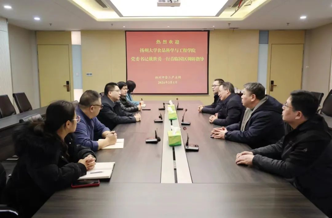 3月1日,院党委书记戴世勇、院长杨振泉率队赴扬州食品产业园调研交流。食品产业园党委书记、管理办主任朱午,党委副书记、管理办副主任陈沿明参加活动。