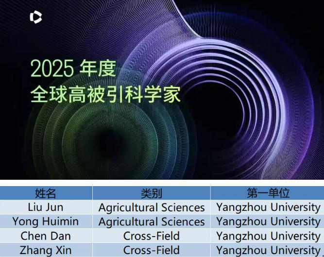 日前,科睿唯安发布了2025年度“全球高被引科学家”名单,表彰在各自研究领域产生重大广泛影响的全球顶尖科研人员。名单中,中国内地以1406人次入选,学院共有4位师生入选!他们分别是农业科学领域刘俊教授、用慧敏老师,交叉学科领域陈丹老师、2020届硕士张欣。