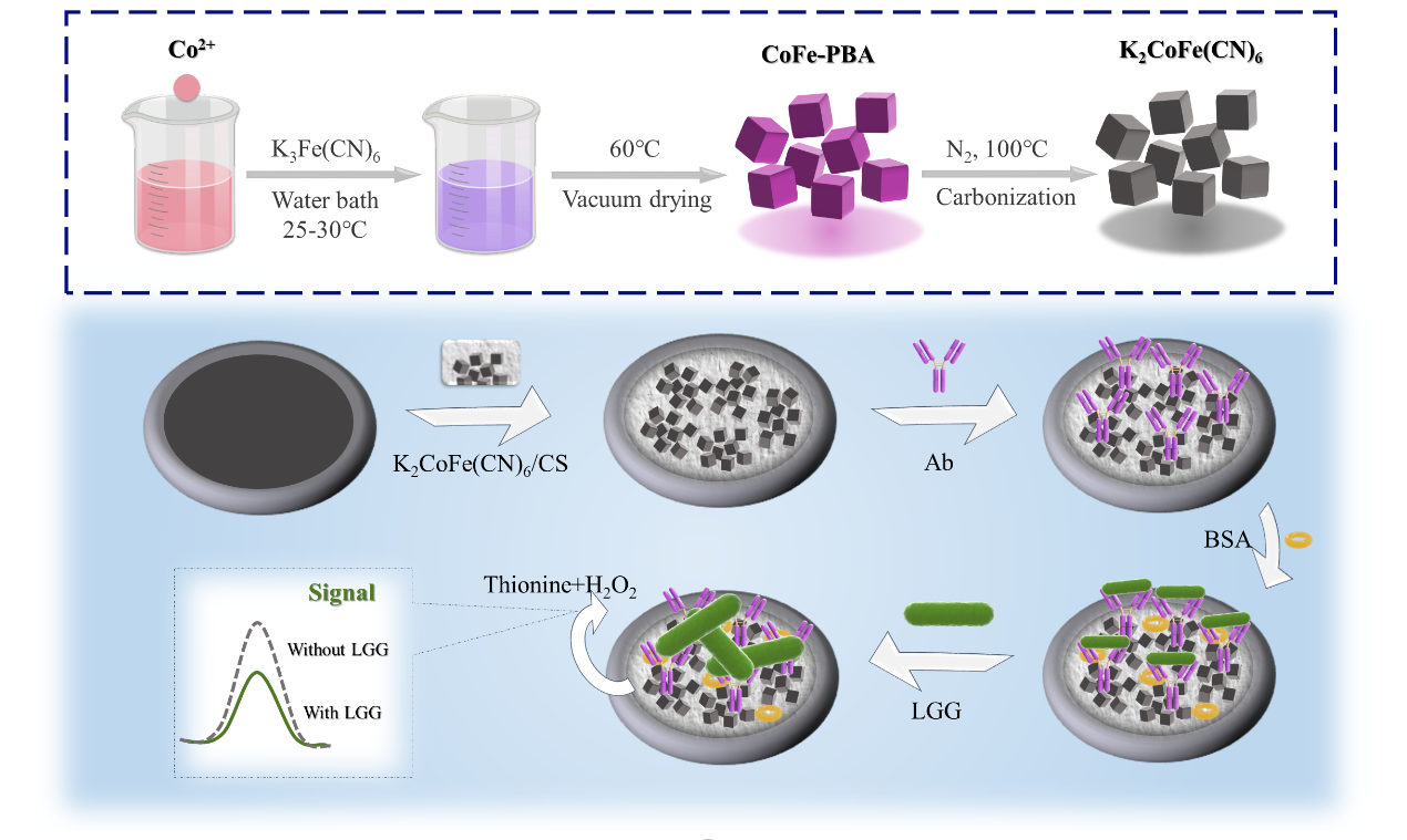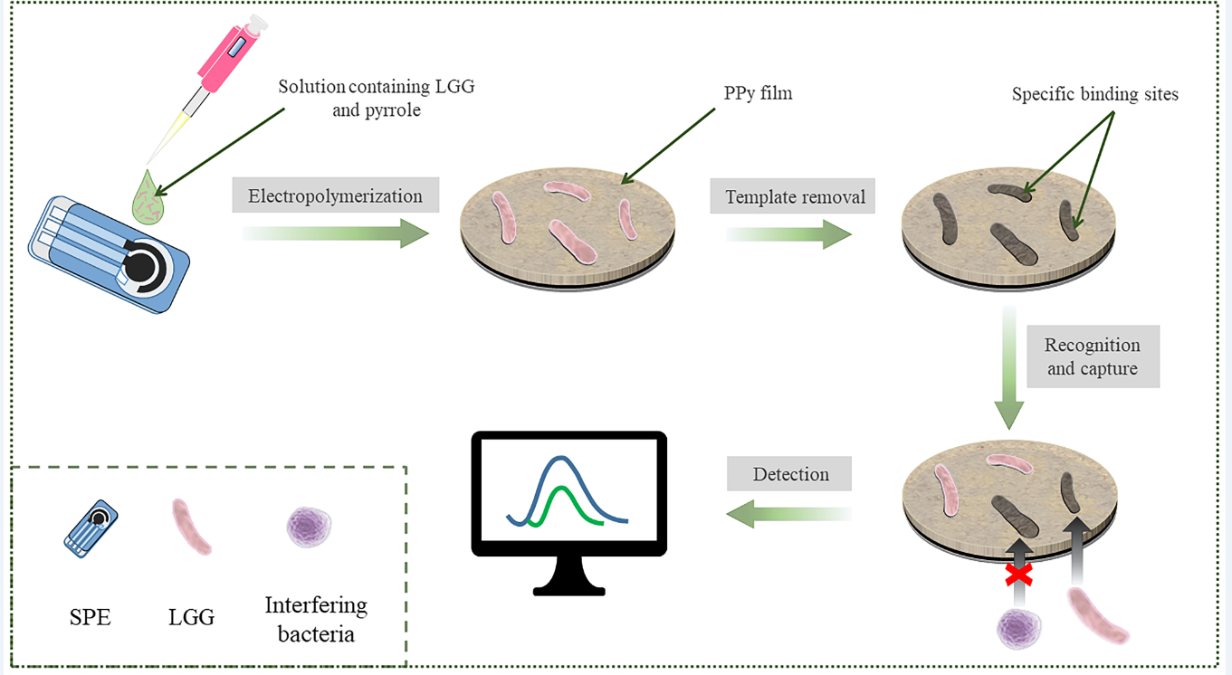 目前,常见的食源性微生物检测方法,主要包括传统的平板培养法、酶联免疫分析和分子生物学的方法,这些方法或存在检测周期长、样品前处理复杂;或成本相对高、有假阳/阴性可能;或不满足实时、快速检测的需要等问题。电化学生物传感器因其具有灵敏度高、成本低、分析速度快、易于小型化等优点在食源性细菌检测方面具有显著优势而备受关注。由此,科研团队一方面结合课题组队前期制备的鼠李糖乳杆菌特异性抗体、纳米酶电催化技术构建了新型的无标记电化学免疫分析方法(图1),该方法能够灵敏、准确地实现乳及乳制品中的鼠李糖乳杆菌定量检测(Talanta,2023, 264, 124746);另一方面研究发现聚吡咯具有优良的生物相容性,杆状细菌能够垂直插入聚吡咯薄膜中,起到良好的包埋作用,聚吡咯印迹膜尚未应用于乳酸菌的定量分析。通过电聚合方法形成特定空穴和空间结构的聚吡咯印迹膜能够与模板细菌互补,从而构建出一种新型的基于聚吡咯印迹膜的细菌电化学传感器(图2),该方法不需要其它生物识别元件同时能够实现对鼠李糖乳杆菌活菌的鉴别(Food Chemistry,2023, 410, 135380)。以上两种电化学检测方法将为包括鼠李糖乳杆菌在内的多种益生菌快速、准确检测提供有益的参考。