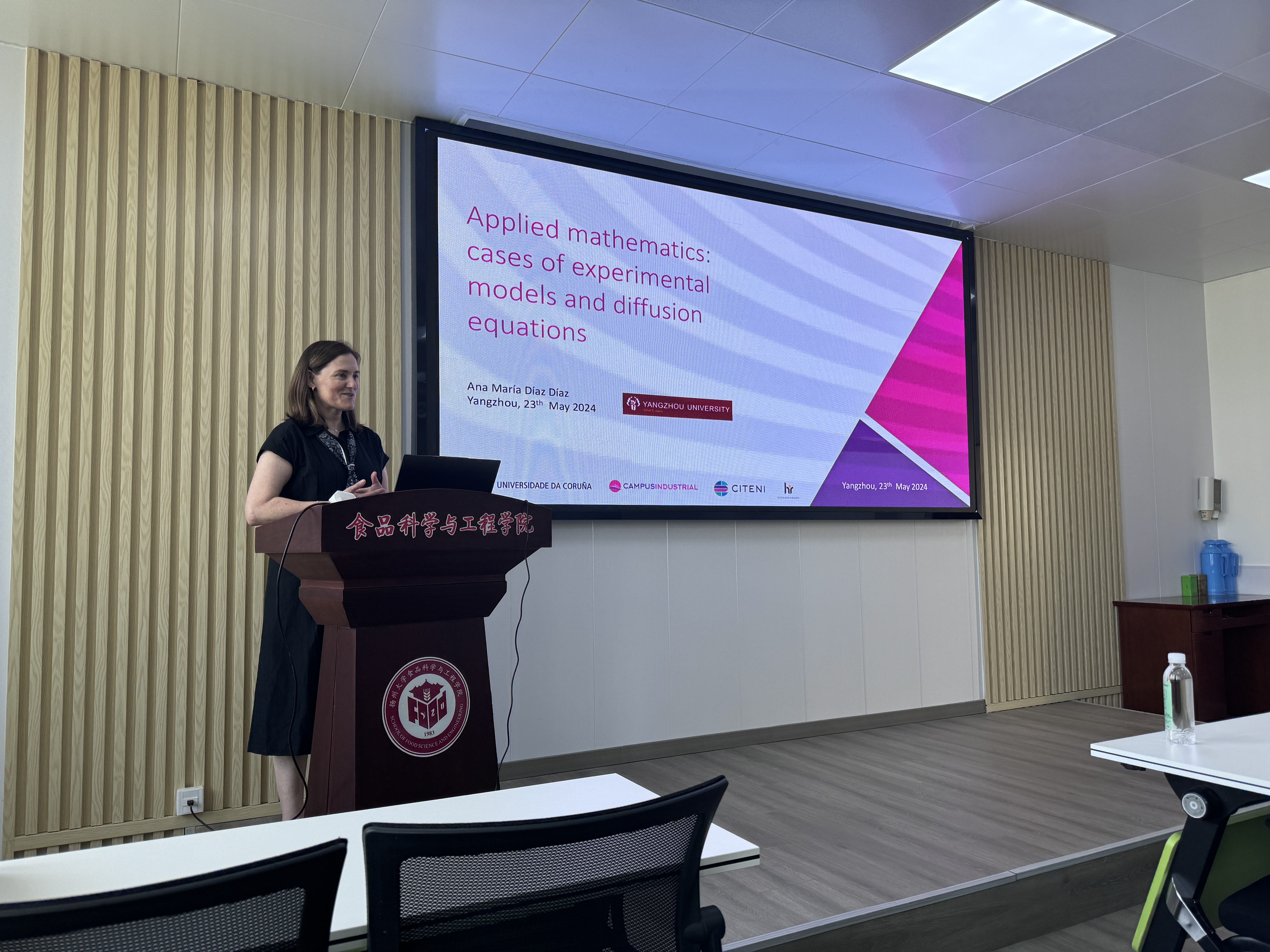 5月24日上午,西班牙拉科鲁尼亚大学Ana María Díaz Díaz副教授来我院进行学术报告,报告题目为:Applied mathematics: cases of experimental application of mathematical models and diffusion equations。在此次报告中,Ana教授介绍了数学模型在食品科学领域的应用等方面的内容:包括活性物质递送的扩散模型、食品非热加工(如焦耳加热)传导效率计算以及在流变学以及热分析(DSC以及TG A)领域的建模计算。