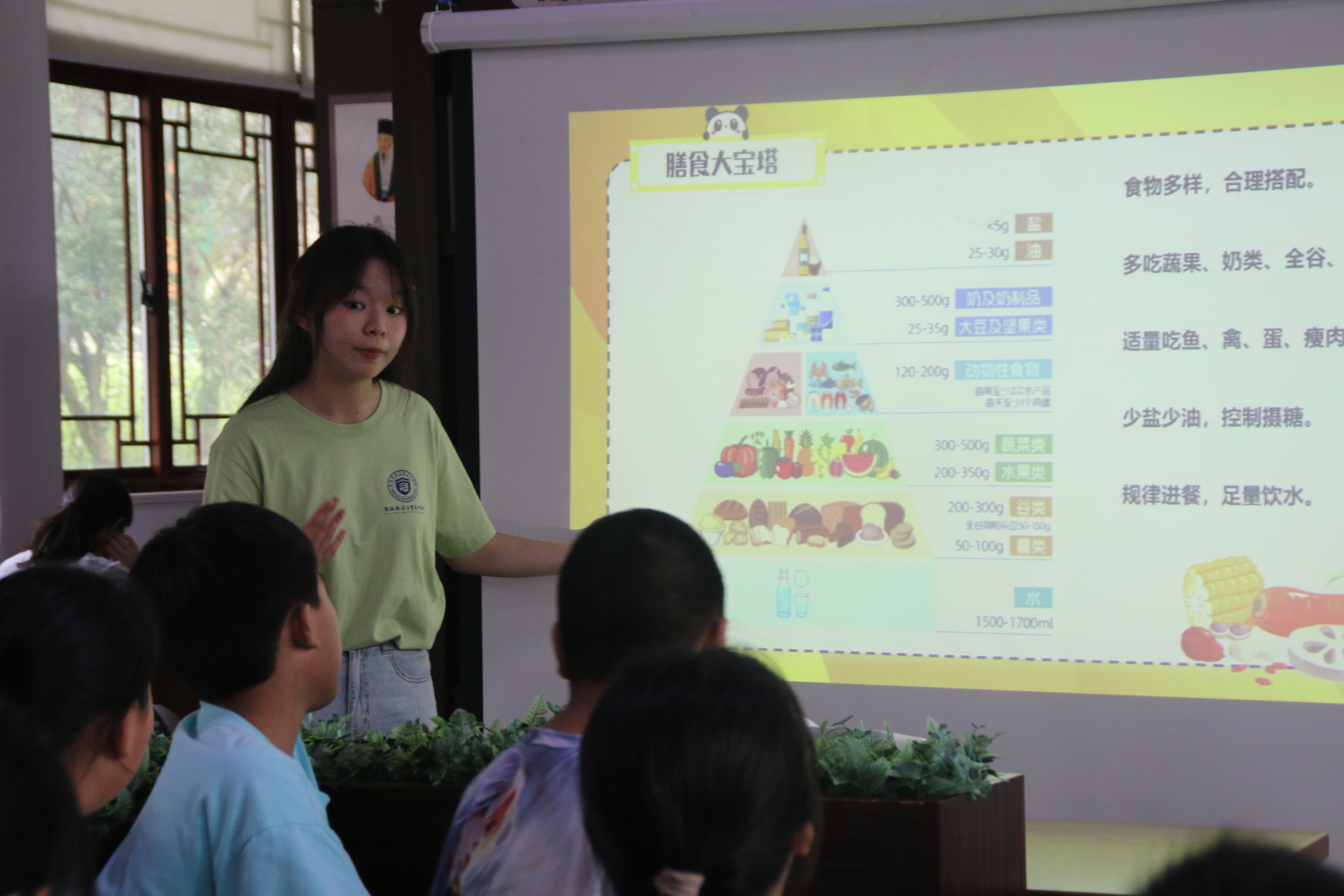 除了游戏环节,大学生们还组织了一场生动的营养膳食讲座,用通俗易懂的语言向孩子们讲解了膳食宝塔的构成、营养素的种类及作用等基础知识,并且让小朋友们对膳食营养宝塔各层中的具体食物一一例举,并告诉小朋友们每天的饮食需要按照今天学会的膳食宝塔搭配,让小朋友自己成为自己的营养家。同时,团队成员还通过展示营养丰富的食品模型和播放生动的动画视频,让孩子们更加直观地了解健康饮食的重要性。