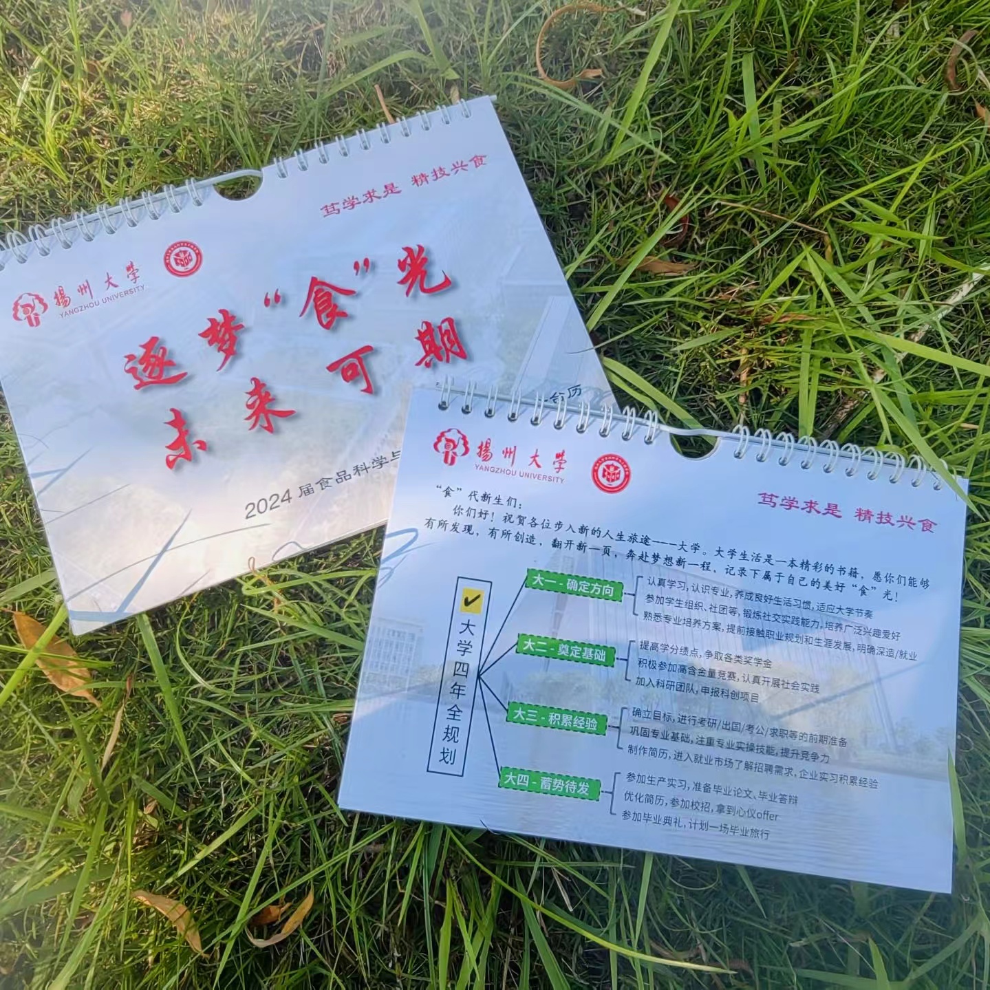 “大学生活是一本精彩的书籍,愿你们能够有所发现,有所创造,翻开台历新的一页,奔赴梦想下一程。”台历的显著位置上印着学院对新生们的殷切寄语。下方是对新生们的未来大学生活的规划建议,期待着新生们都够在大学中奋发有为、展现自我、绽放光彩。内页以扬州大学每一个校区的特色景点为背景,为新生们徐徐展开一副扬州大学的校园卷轴,让新生们提前了解到扬州大学的校区氛围,能够提高新生们对于大学生活的热爱和向往。